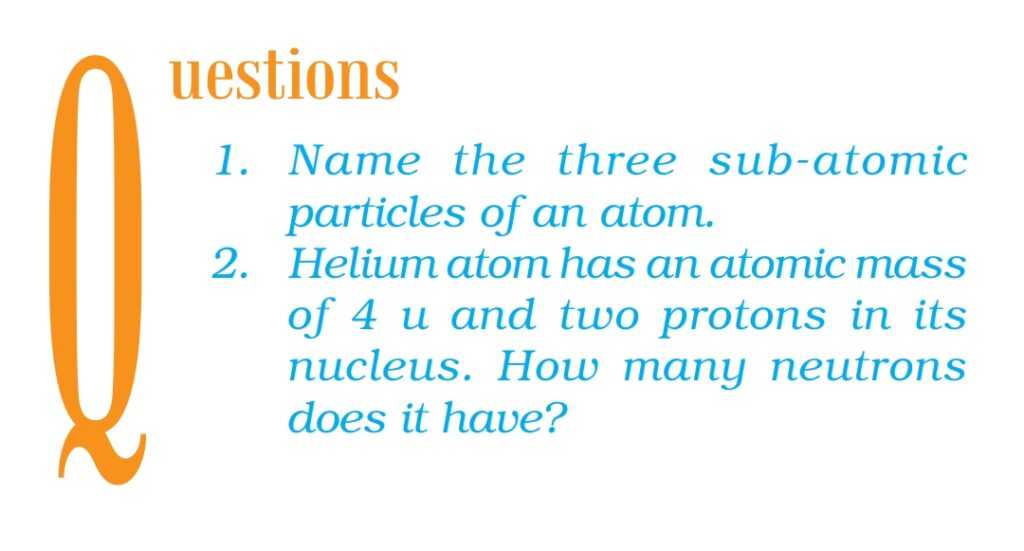 Answer:1. Three sub atomic particles are electron, proton and neutron.