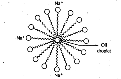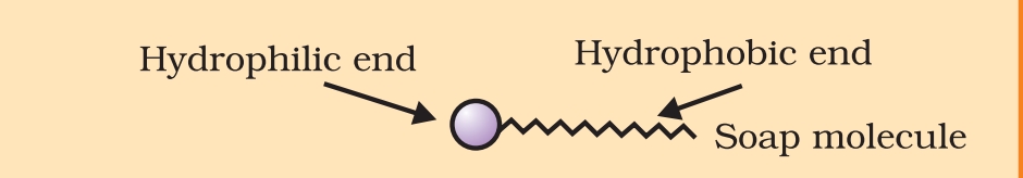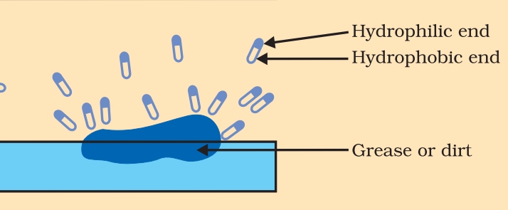 Ans. When soap is at the surface of water, the hydrophobic ‘tail’ of soap will not be soluble in water and the soap will align along the surface of water with the ionic end in water and the hydrocarbon ‘tail’ protruding out of water. Inside water, these molecules have a unique orientation that keeps the hydrocarbon portion out of the water. Thus, clusters of molecules in which the hydrophobic tails are in the interior of the cluster and the ionic ends are on the surface of the cluster. This formation is called a micelle. Soap in the form of a micelle is able to clean, since the oily dirt will be collected in the centre of the micelle. The micelles stay in solution as a colloid and will not come together to precipitate because of ion-ion repulsion. Thus, the dirt suspended in the micelles is also easily rinsed away.
