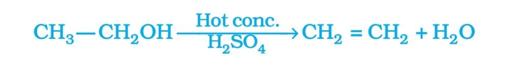 - Conversion of ethane to ethene: Heating ethanol at 443 K with excess concentrated sulphuric acid results in the dehydration of ethanol to give ethene. Conc. Sulphuric acid acts as dehydrating agent.