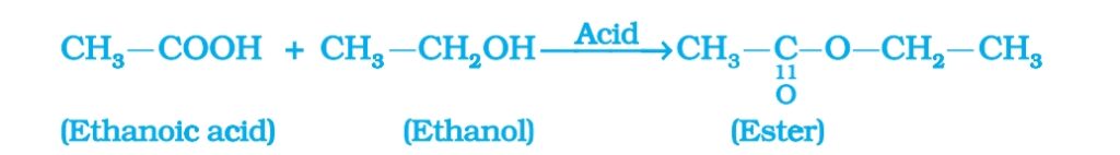 - Esterification reaction: Ethanoic acid react with absolute ethanol in the presence of an acid catalyst to form ester. Esters are sweet smelling substances. Easters are used in making perfumes and flavouring agents.