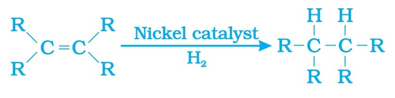 Addition reaction: Unsaturated hydrocarbon like alkene react with hydrogen gas in the presence of Nickel or Palladium catalyst to give saturated hydrocarbon like alkane. Vegetable oil which is an unsaturated hydrocarbon is converted into Vegetable ghee by the process of hydrogenation.