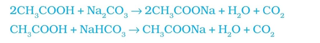 4. Reaction with carbonate and hydrogen carbonate: Ethanoic acid react carbonate and hydrogen carbonate to form sodium acetate, water and carbon dioxide. This reaction is used for testing ethanoic acid . CO2 formed extinguish a burning candle or make lime water milky.