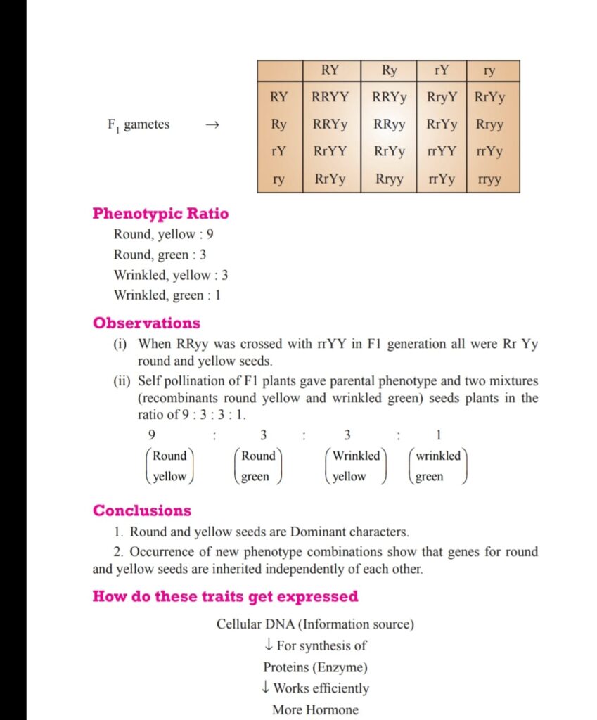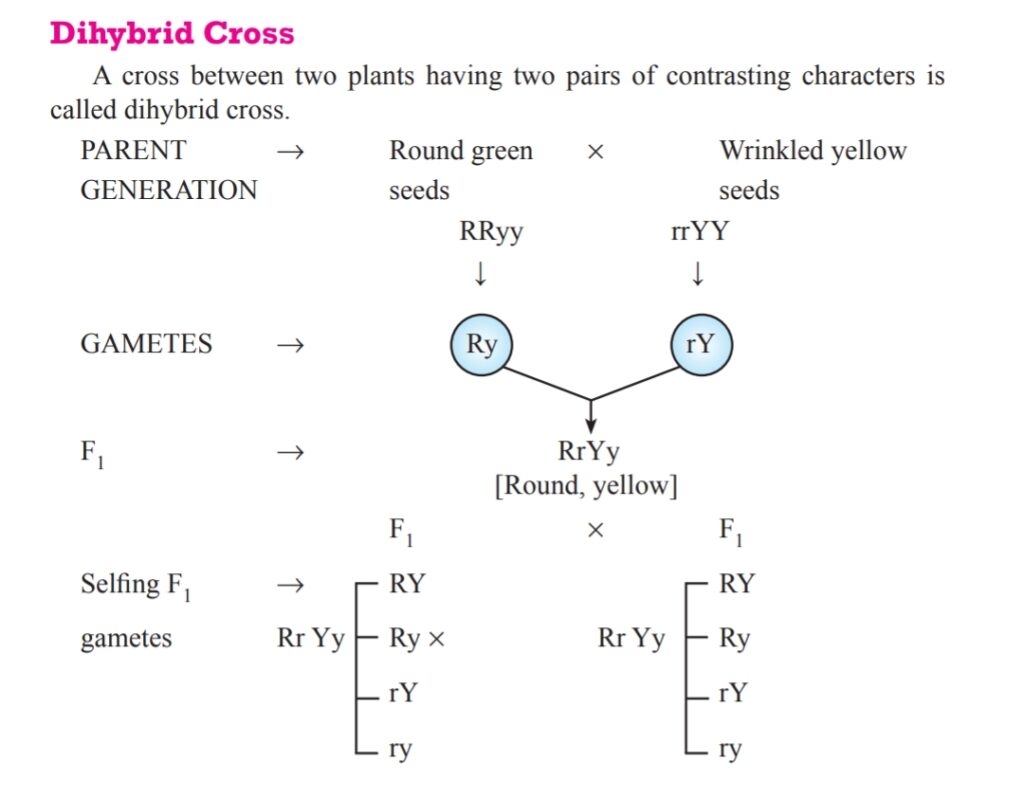 Ans. An example of separation of gametes in a dihybrid cross is when the alleles of one parent seperate/segregate randomly into gametes, with half of the parent’s gametes carrying each allele. This is known as Mendel’s Law of Segregation. Example RrYy separated as RY, Ry, rY,ry.
